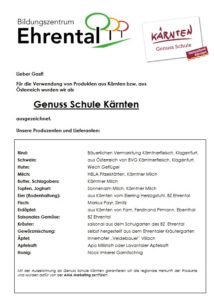 Mit der Auszeichnung als Genuss Schule Kärnten garantieren wir die regionale Herkunft der Produkte und wurden dafür von der AMA Marketing zertifiziert.